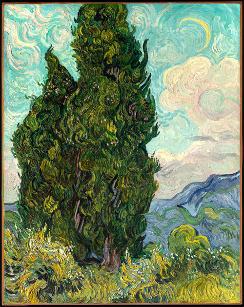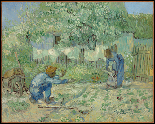 サン=レミの精神病棟滞在終わりごろの冬、彼は何度かの発作を続けて起こしており、外へ出られず建物内にこもっていた期間が長くあったようです。あるいは、冬で天候の悪いときもあったでしょう。そんなとき彼は、療養所内に特別に許されたアトリエで、先人たちの油絵やエッチングの写真を使って、これを彼なりの解釈で模写をする仕事をして、「自由な解釈」による模写の傑作を多く残しました。本作はその一つで、ミレーのスケッチ画から取ったものです。これらの模写は、この時期に30点以上描かれましたが、そのうちの21点が、ゴッホが最も尊敬する画家ミレーによるものでした。本作は、ミレーによる薄い色を乗せたスケッチ画を元にして、油絵で色を乗せたものですが、オリジナルの色彩と異なっていて、自由な色彩で描かれています。