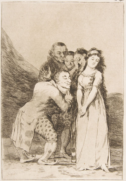 この版画は、ロス・カプリチョスという全部で80点ある連作の中のひとつです。ロス・カプリチョスとは「気まぐれ」という意味で、ありとあらゆる奇怪で滑稽な風景が次から次へと描写されています。ここにあげた作では、脚が曲がって背中に瘤のできた醜い貴族の男に、うら若い女性が差し出されています。いかにも淫らそうに女に近寄る好色な男が見飽きませんね。周りの連中は、女を差し出す側だったり、差し出される側だったりするのでしょう。さまざまなしぐさと表情をしています。