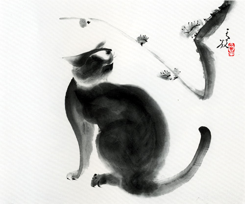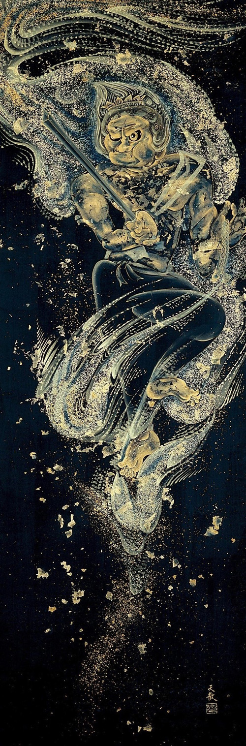 橘天敬は昭和期を主に活躍した日本画家です。明治39年(1906)に生まれ、昭和59年(1984)に享年77歳にて亡くなるまで、その生涯は波乱万丈で、屏風絵な ど大作の多くは広く海外に渡っています。剛毅と豊麗さあふれる大胆な屏風絵から、淡墨で描く繊細で可愛らしい小さな雀に至るまで、日本の伝統を重んじながら、あくまで独創性とロマンを追求した画風は躍動感 に満ち、魂、心、気道を感じさせる不思議なエネルギーがあります。天敬は世界中の人々に作品を見てもらいたいという願いが強く、下絵を一切描かずに 表現した生命力あふれる屏風絵の数々は、英国の大英博物館やアメリカのフーリア美術館など、主に海外の美術館に収蔵されています。