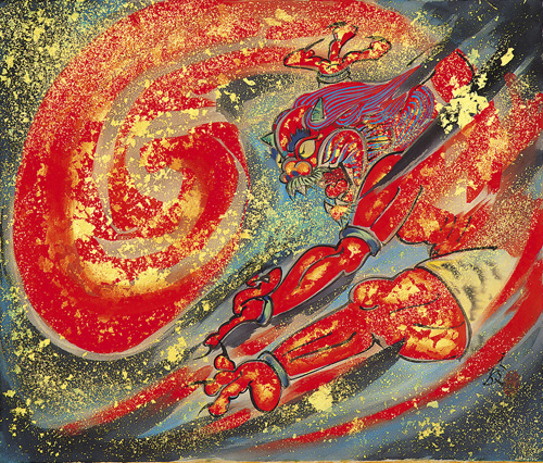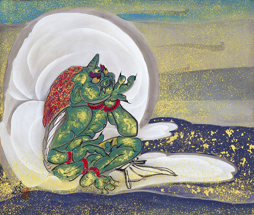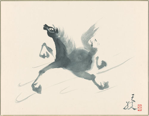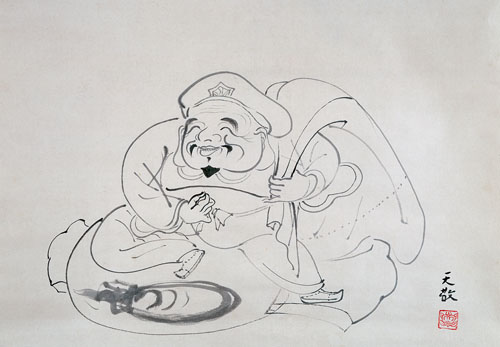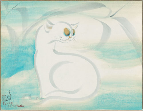 橘天敬は昭和期を主に活躍した日本画家です。明治39年(1906)に生まれ、昭和59年(1984)に享年77歳にて亡くなるまで、その生涯は波乱万丈で、屏風絵な ど大作の多くは広く海外に渡っています。剛毅と豊麗さあふれる大胆な屏風絵から、淡墨で描く繊細で可愛らしい小さな雀に至るまで、日本の伝統を重んじながら、あくまで独創性とロマンを追求した画風は躍動感 に満ち、魂、心、気道を感じさせる不思議なエネルギーがあります。天敬は世界中の人々に作品を見てもらいたいという願いが強く、下絵を一切描かずに 表現した生命力あふれる屏風絵の数々は、英国の大英博物館やアメリカのフーリア美術館など、主に海外の美術館に収蔵されています。 →