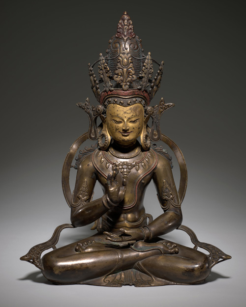 この彫刻はおそらく、チベット西部のエレガントなブロンズ像の一群のひとつであり、パラ(Pala)の時代(700年代~1100年代)のインド彫刻の高度な職人技とのつながりを示しています。 目は銀で象眼されており、ネックレス、王冠、髪飾りには赤い色素が残っています。